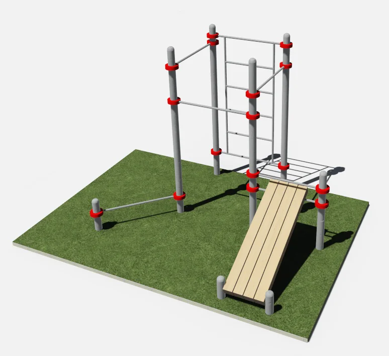 Составляющими данного комплекса являются шведская стенка, скамья для пресса, турники для подтягиваний и турник для отжиманий.