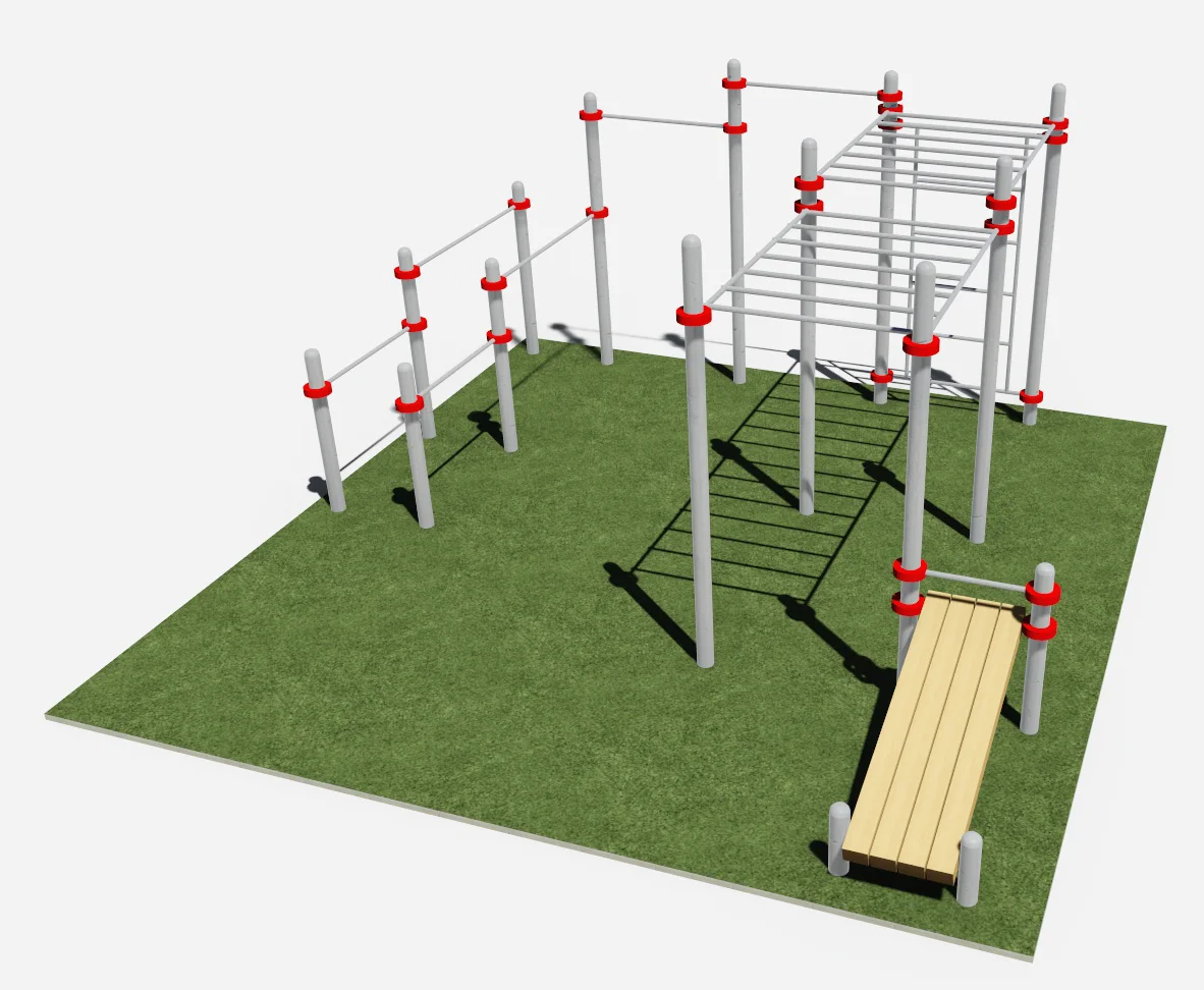 Составляющими данного комплекса являются шведская стенка, два рукохода классических, два турника, брусья двойные разноуровневые, скамья для пресса. Шведская стенка крепятся на высоте 2350 мм к опорным столбам высотой 2600 мм.